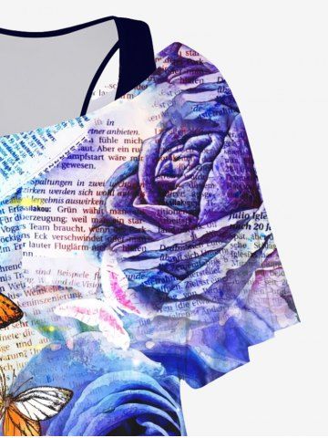 Plus Size Racerback Tank Top And Butterfly Newspaper Rose Flower Print T-shirt - Multi-a - 1x