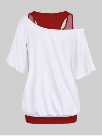 Plus Size Racerback Tank Top and Rose Flower Birds Ripped Glass 3D Print T-shirt - Red - S