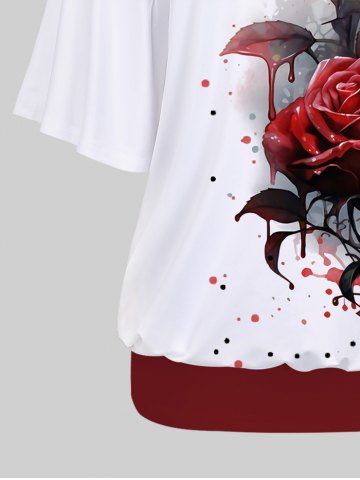 Plus Size Racerback Tank Top and Rose Flower Leaf Dripping Blood Print Batwing Sleeve T-shirt - Deep Red - 5x