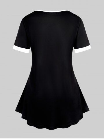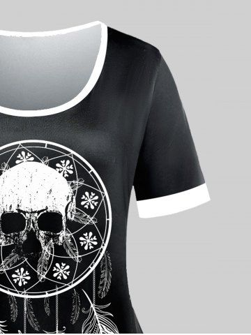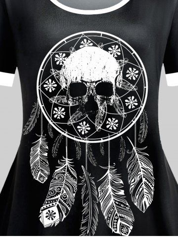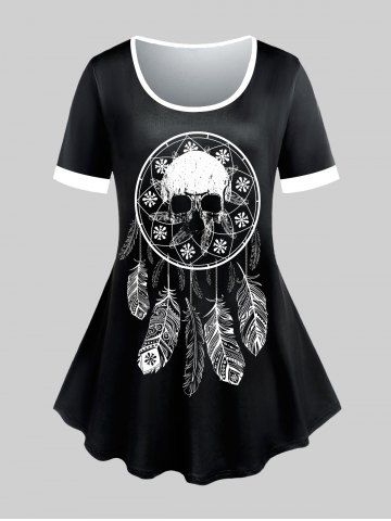 Plus Size Skull Feather Printed Two Tone Ringer Tee - Black - L | Us 12