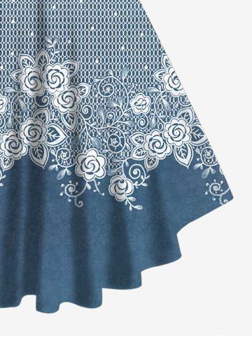 Plus Size Rose Flower Braided Plaid Print Lattice T-shirt - Blue Gray - L