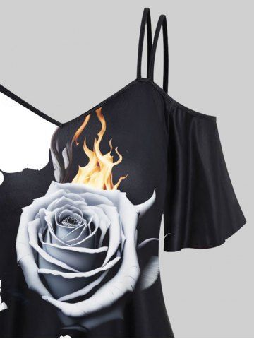 Plus Size Rose Flower Colorblock Fire Flame Print Cold Shoulder T-shirt - Multi-a - 4x