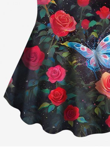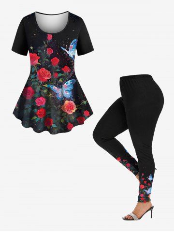 Plus Size Rose Flower Glitter Butterfly Print Women T-shirt - Black - 3x