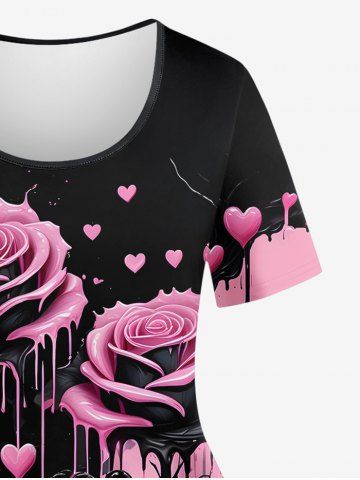 Plus Size Rose Flower Heart Paint Drop Blobs Colorblock Print T-shirt - Black - 2x