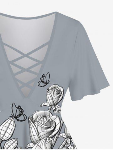 Plus Size Rose Flower Leaf Butterfly Print Crisscross Lattice Flare Sleeve T-shirt - Gray - S