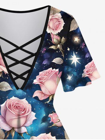 Plus Size Rose Flower Leaf Galaxy Star Glitter 3D Print Lattice Crisscross Flare sleeve T-shirt - Black - 6x