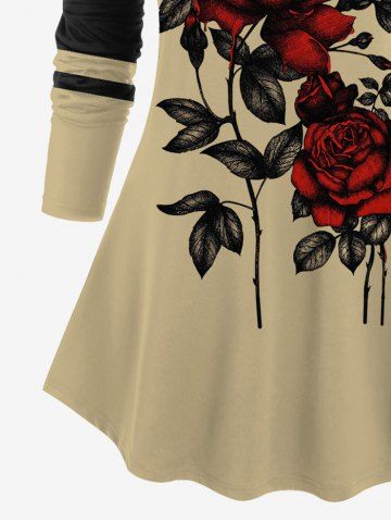 Plus Size Rose Flowers Leaf Colorblock Print Raglan Sleeve T-shirt - Light Coffee - M