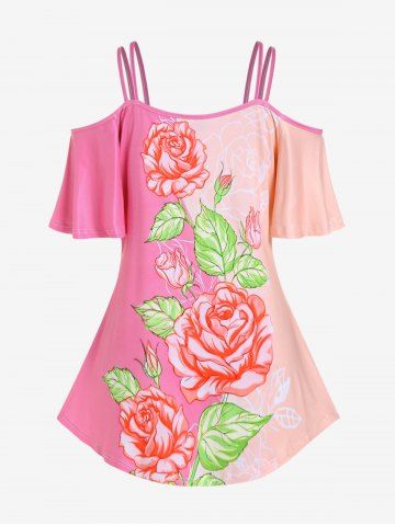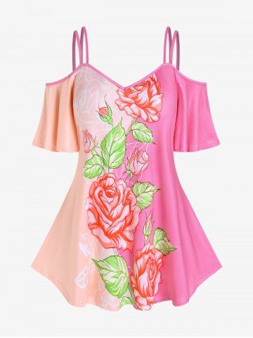 Graphic Tees > Plus Size Rose Print Colorblock Cold Shoulder Tee