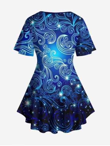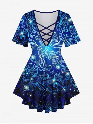 Plus Size Sea Waves Glitter 3D Print Lattice Crisscross Flare Sleeve T-shirt - Deep Blue - 5x