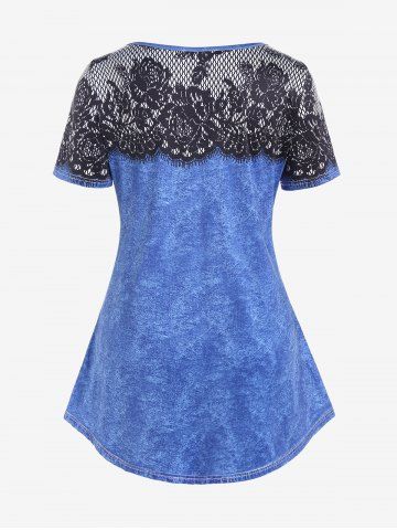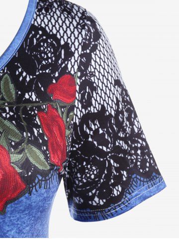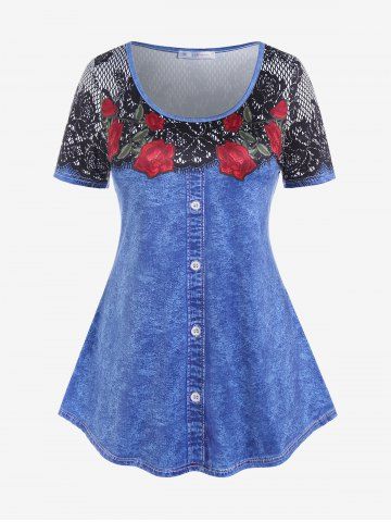 j*****o5Plus Size Short Sleeve Rose 3D Denim Lace Print TeeColor: BLUE Size: L | US 12I haven't had it on yet looking forward to it I bought it because of the roses on it reminds me of my mom.
