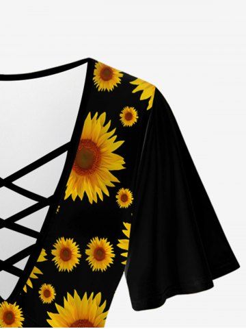 Plus Size Short Sleeves Sunflower Printed Crisscross Plunging Tee - Deep Yellow - 1x | Us 14-16