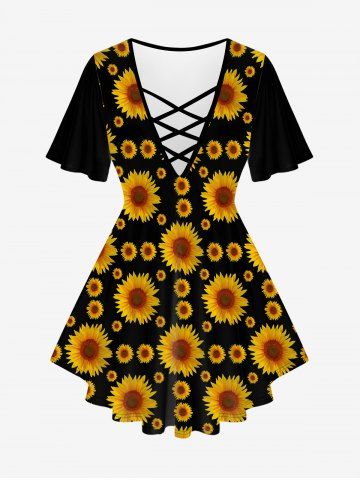 Graphic Tees > Plus Size Short Sleeves Sunflower Printed Crisscross Plunging Tee