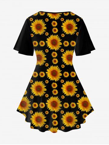 Plus Size Short Sleeves Sunflower Printed Crisscross Plunging Tee - Deep Yellow - 4x | Us 26-28