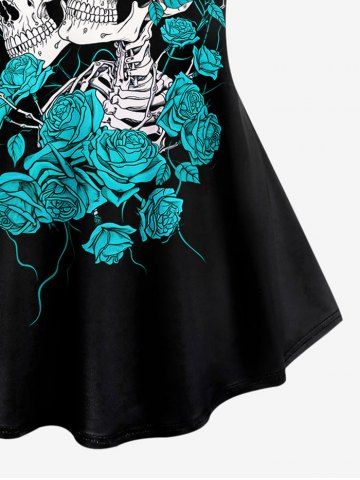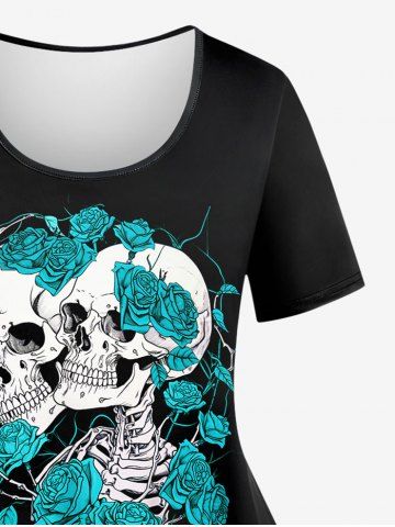 Plus Size Skeleton Lovers Rose Flower Heart Print Short Sleeves T-shirt - Blue - 6x