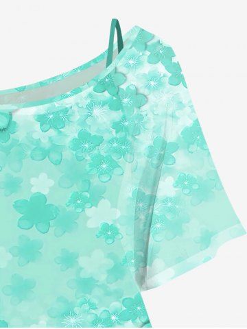 Plus Size Skew Neck Batwing Sleeves Ombre Flower Print T-shirt - Light Green - 2x