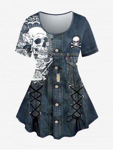 B*****i5Skull Buttons Lace Up Denim 3D Printed T-shirt and Flare Pants Plus Size 70s 80s OutfitColor: DEEP BLUEso so so pretty and comfortable, pant legs are a little too long though