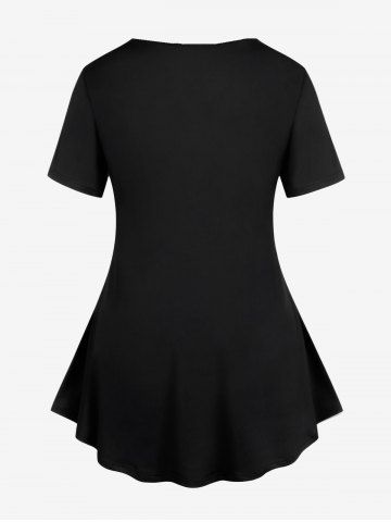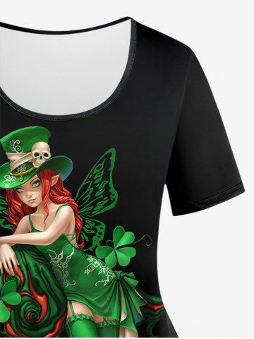 Plus Size Skull Hat Four Leaf Clover Elf Butterfly Wing Print Short Sleeves T-shirt - Black - 4x