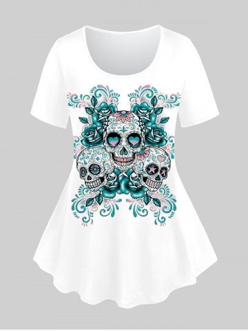 Plus Size Skulls Flower Print Short Sleeves T-shirt - White - S