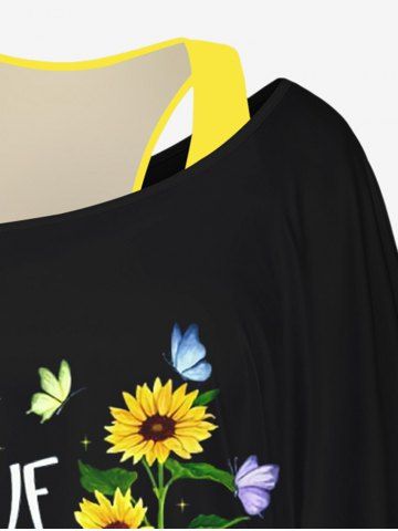 Plus Size Solid Racerback Tank Top and Sunflower Butterfly Letter Print Skew Neck Batwing Sleeves T-shirt Set - Black - L