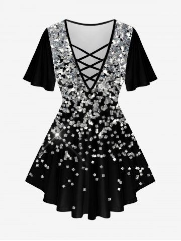 Plus Size Sparkles Glitter Printed Crisscross Short Sleeves Tee