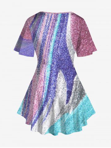 Plus Size Sparkling Sequin Glitter Colorblock 3D Print Lattice Crisscross Flare Sleeve T-shirt - Multi-a - L