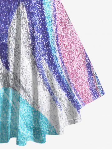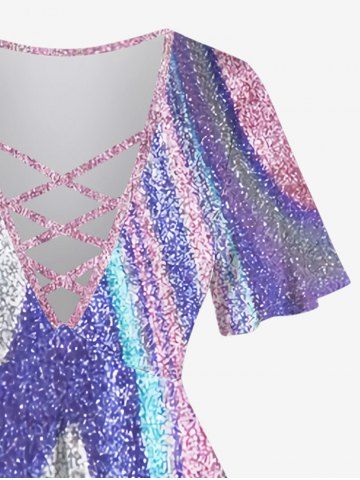 Plus Size Sparkling Sequin Glitter Colorblock 3D Print Lattice Crisscross Flare Sleeve T-shirt - Multi-a - 3x