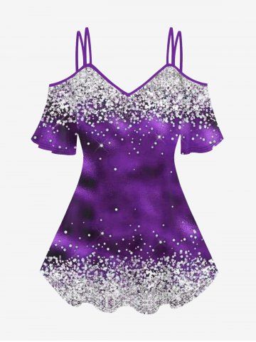 Plus Size Sparkling Sequins Print Cold Shoulder T-shirt - Purple - L | Us 12