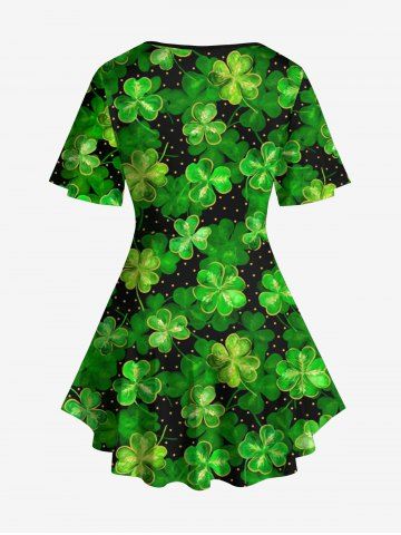 Plus Size St. Patrick's Day Clover Print Lattice Crisscross Flare Short Sleeve T-shirt - Green - 4x