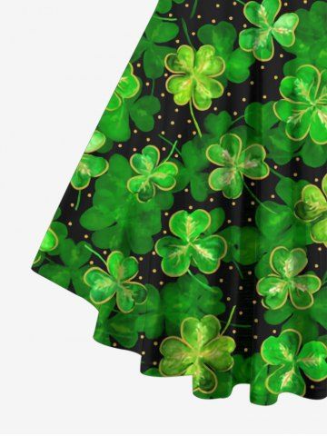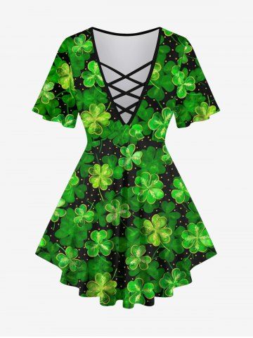 Plus Size St. Patrick's Day Clover Print Lattice Crisscross Flare Short Sleeve T-shirt - Green - 5x