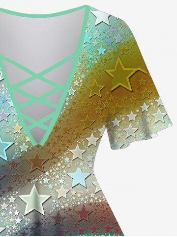 Plus Size Star Rainbow Colorblock Glitter 3D Print Lattice Crisscross Flare Sleeve T-shirt - Multi-a - 5x