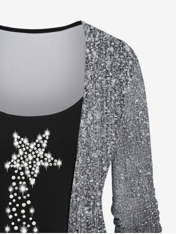 Plus Size Stars Sparkling Sequin Colorblock Glitter 3D Print Long Sleeve 2 In 1 T-shirt - Black - 6x