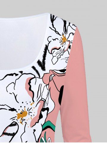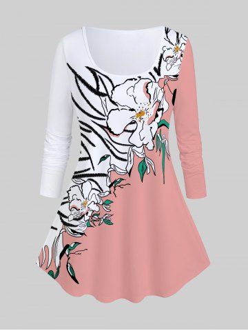 Plus Size Stripes Flower Printed Colorblock Long Sleeves Tee - Light Pink - L | Us 12