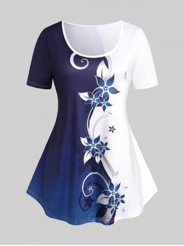 Colorblock Short Sleeves Tee and Colorblock Flower Printed Leggings Plus Size Summer Outfit