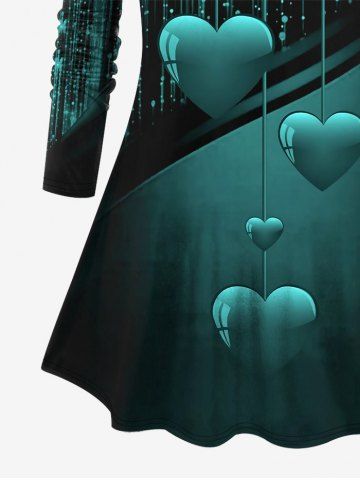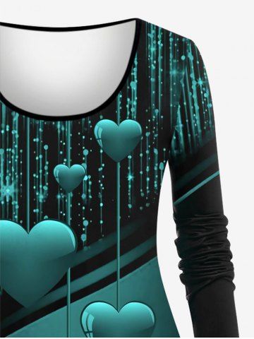 Plus Size Valentine's Day Heart Colorblock Glitter Tassel 3D Print Long Sleeve T-shirt - Deep Green - 5x