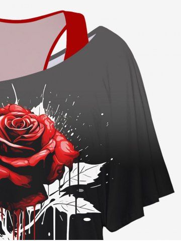 Racerback Tank Top and Rose Flower Paint Splatter Print Skew Neck T-shirt - Black - L