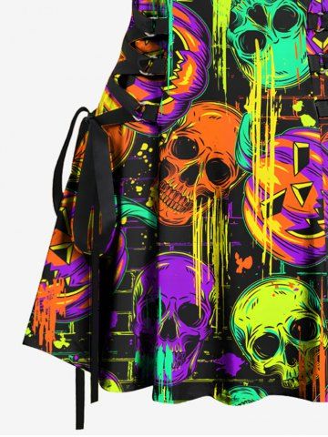 Colorful Skull Pumpkin Print Halloween Lace Up A Line Tank Dress - Black - L
