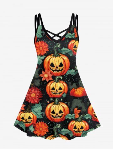 Gothic Pumpkin Leaf Print Crisscross Halloween Cami Dress - Multi-a - 1x