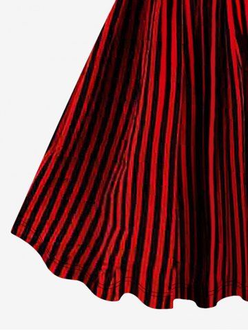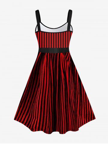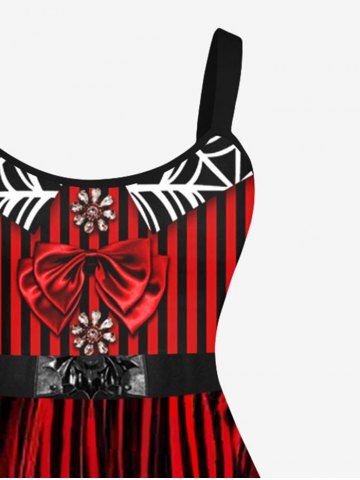 Plus Size 3D Bowknot Striped Bat Belt Spider Web Print Halloween Tank Dress - Deep Red - S