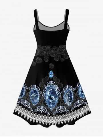 Plus Size 3D Eagle Rose Floral Paisley Belt Print Halloween Tank Dress - Blue - Xs