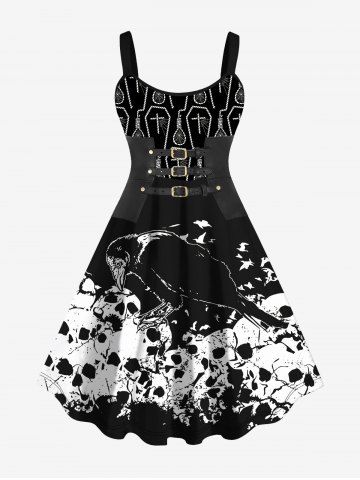 Plus Size 3D PU Panel Buckle Eagle Skulls Cross Print Halloween Tank Dress - Black - 2x