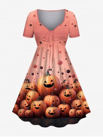 Plus Size 3D Pumpkins Flowers Print Halloween Cinched Ombre Dress - Light Pink - 5x