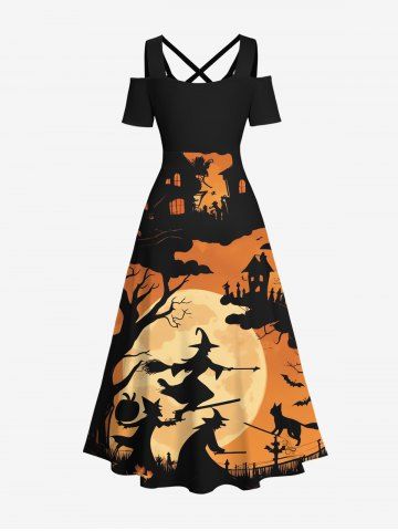 Halloween Dresses > Plus Size Bat Castle Cat Wizard Tree Moon Print Halloween Crisscross A Line Maxi Dress