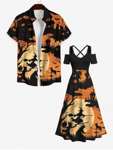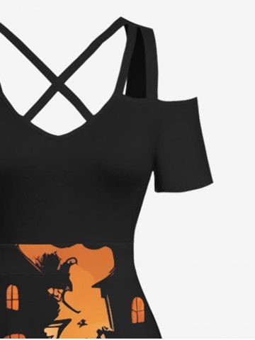 Plus Size Bat Castle Cat Wizard Tree Moon Print Halloween Crisscross A Line Maxi Dress - Dark Orange - 1x