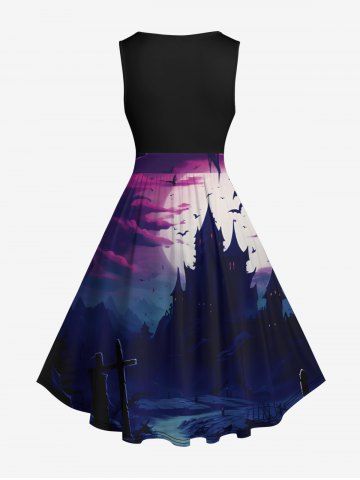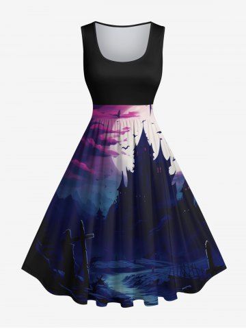 Plus Size Bat Castle Moon Cross Ombre Midnight River Print Halloween Costume Vintage Swing A Line Dress - Black - M