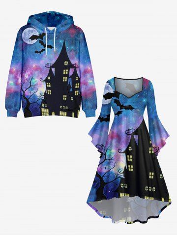 Halloween Dresses > Plus Size Bat Moon Tree Branch Castle Colorful Ombre Galaxy Print Halloween Costume Ruched High Low Asymmetric Dress