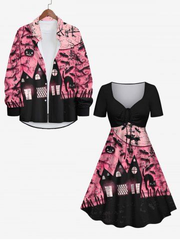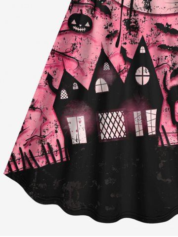Plus Size Bat Pumpkin Tree Branch Cat Ink Painting Castle Print Halloween Costume Cinched A Line Dress - Light Pink - 2x