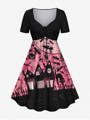 Plus Size Bat Pumpkin Tree Branch Cat Ink Painting Castle Print Halloween Costume Cinched A Line Dress - Light Pink - 6x