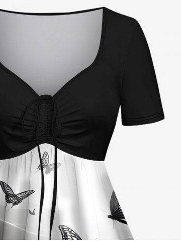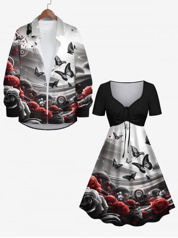 Plus Size Butterfly Rose Flower Ombre Light Beam Print Halloween Costume Cinched A Line Dress - Black - L