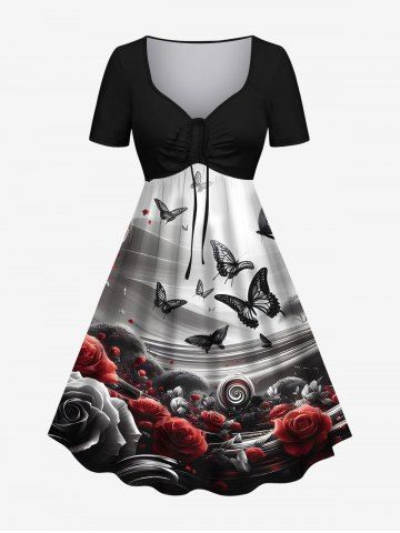 Plus Size Butterfly Rose Flower Ombre Light Beam Print Halloween Costume Cinched A Line Dress - Black - 1x