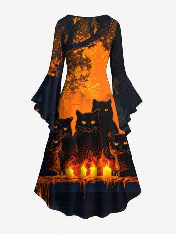Halloween Dresses > Plus Size Cat Candle Tree Print Halloween Ruched High Low Asymmetric Dress